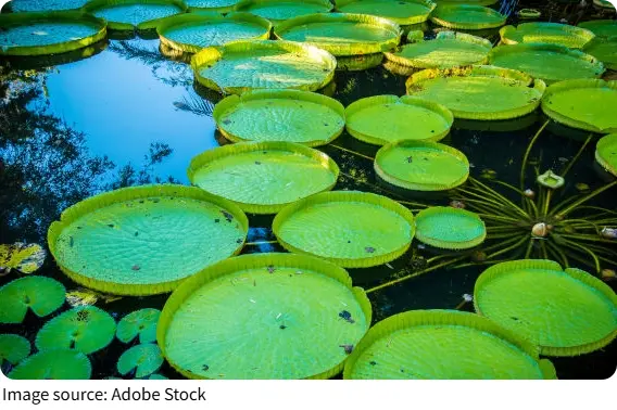 Mauritius lily pads are not your average aquatic plant. Their leaves can grow over two meters across, and their flowers open in the morning, showing off white or pink petals that can last for several days.